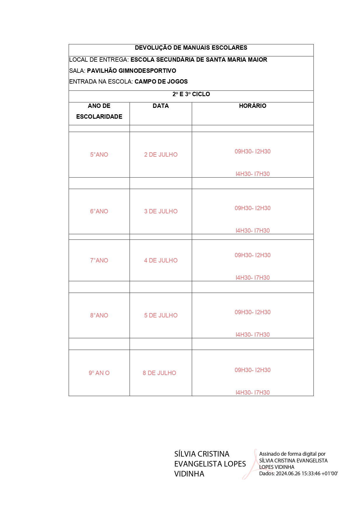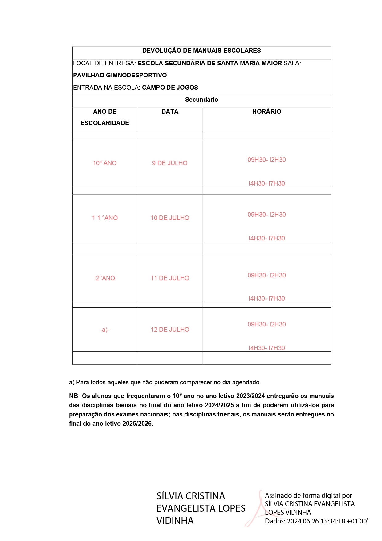 Exmo. Senhor Encarregado de Educação, Conforme legislação em vigor, após o final do ano letivo, os manuais escolares cedidos a título de empréstimo devem ser devolvidos à escola. Solicita-se, por isso, que se desloque à escola, para devolução dos manuais escolares no dia e hora(s) fixada(s) para o seu educando. (Circular completa AQUI)