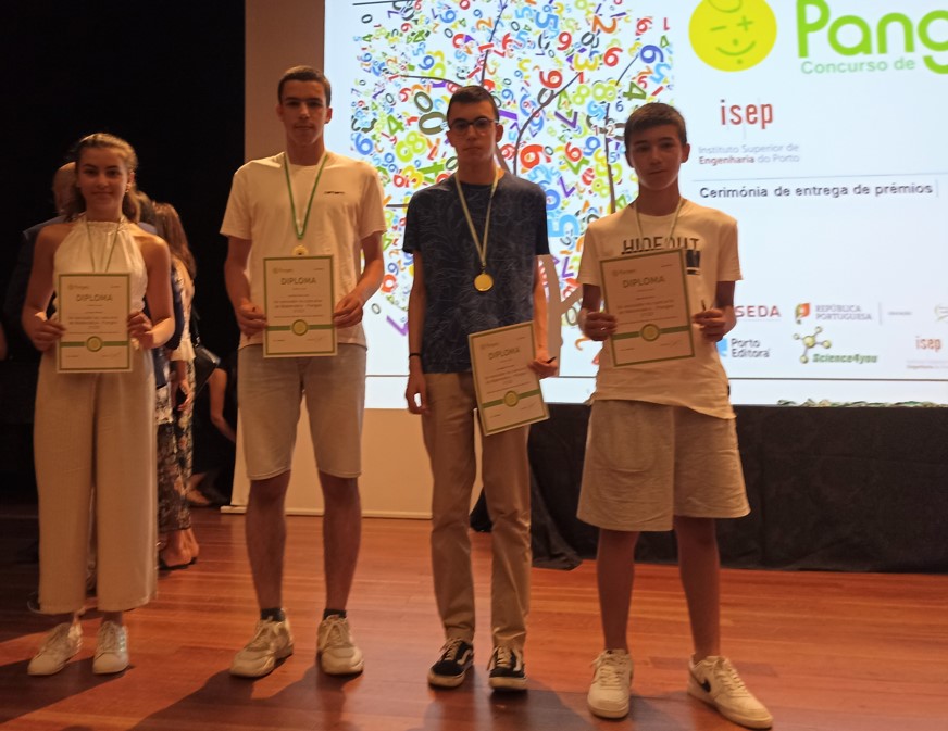 Os alunos Lara Barbosa ( 8ºG), Luís Costa (10º E), Nuno Lopes (8ºE) e Miguel Pinto (7ºE) no dia 9 de julho estiveram no Instituto Superior de Engenharia no Porto, para receberem o diploma e a medalha de mérito por estarem entre os 10 melhores na sua categoria a nível nacional no concurso matemático Pangea. Parabéns pelos excelentes resultados!