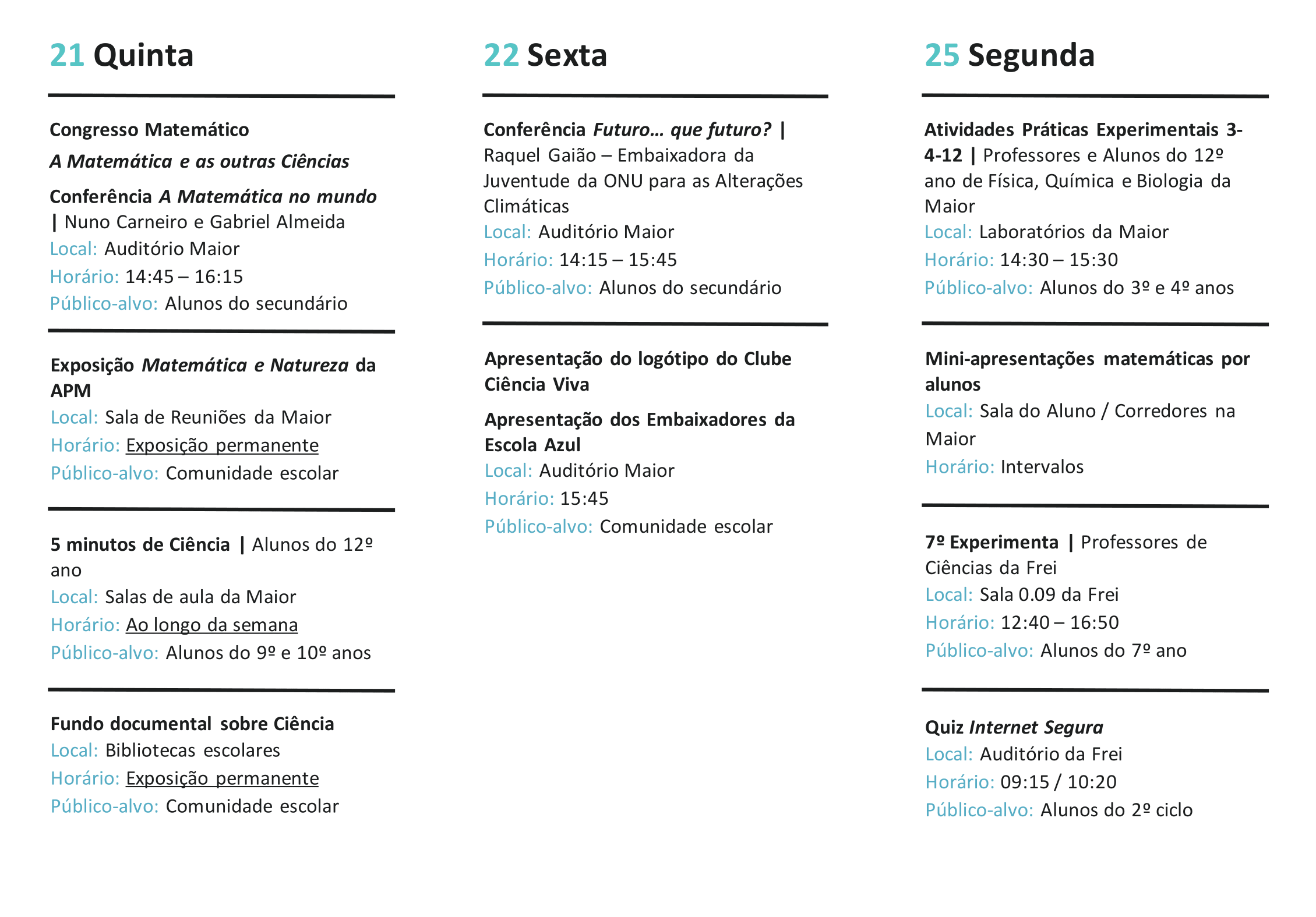 No âmbito do Projeto PES, o GAF e a Escola Segura realizaram duas sessões de sensibilização contra a violência no namoro, no dia 27 de Novembro, Auditório Maior, dirigidas aos jovens da Escola Secundária de Santa Maria Maior.