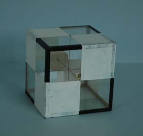 Modelo cristalográfico em vidro, com sistema de eixos axiais representados por fio de algodão colorido no seu interior, utilizado na visualização da estrutura interna dos minerais nas aulas de Mineralogia/Geologia. As arestas encontram-se coladas e revestidas a fita adesiva preta.