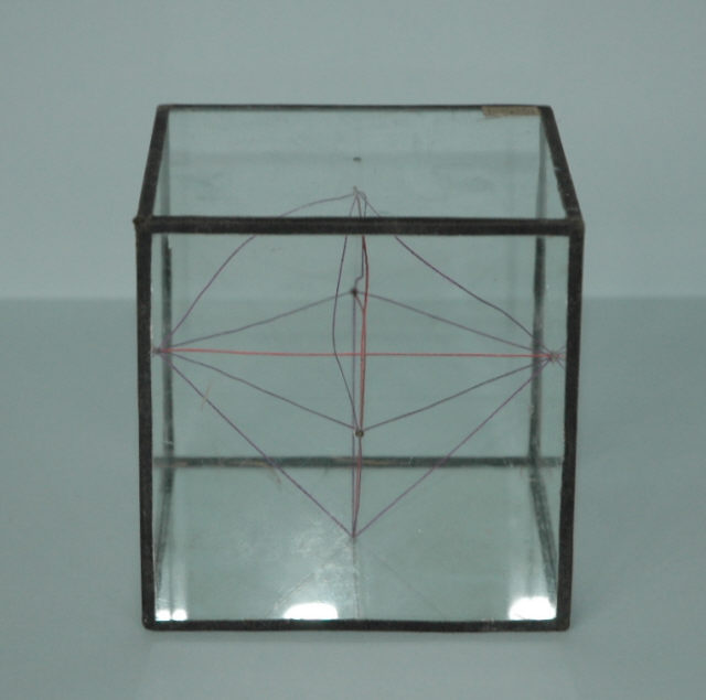 Modelo cristalográfico em vidro, com sistema de eixos axiais representados por fio de algodão colorido no seu interior, utilizado na visualização da estrutura interna dos minerais nas aulas de Mineralogia/Geologia. As arestas encontram-se coladas e revestidas a fita adesiva preta.