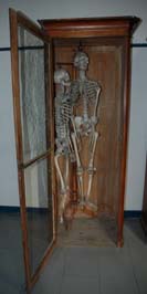 Modelo de esqueleto humano utilizado para o estudo e observação dos ossos humanos nas aulas de Ciências Naturais/Biologia. Trata-se de um esqueleto articulado, suspenso de suporte vertical de madeira, preso por filamentos de metal. O esqueleto humano tem como função principal sustentar e dar forma ao corpo, protegendo determinados órgãos vitais, como, por exemplo, o cérebro, que é protegido pelo crânio, e também os pulmões e o coração, que são protegidos pelas costelas e pelo esterno. Os ossos do corpo humano variam de formato e tamanho: o maior é o fémur (localizado na zona da coxa) e o menor é o estribo (localizado dentro do ouvido médio).