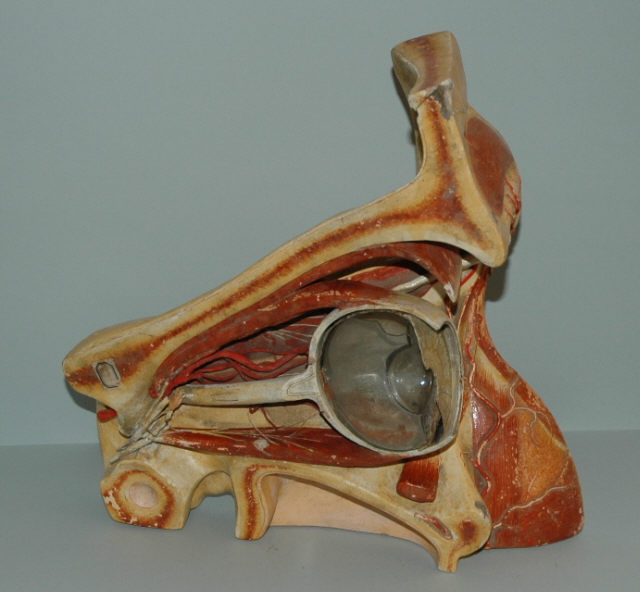 Modelo anatómico do olho humano em corte, permitindo ver a constituição interna deste orgão. Este modelo era utilizado para estudo e observação nas aulas de Ciências Naturais.