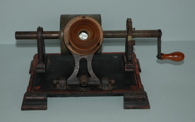 Fonógrafo de Edison composto por um cone, na extremidade do qual se encontra uma membrana flexível com um pequeno estilete rígido que pousa sobre um cilindro com sulcos coberto por uma folha de estanho. O cilindro é posto em rotação por uma manivela. O aparelho encontra-se sobre uma base metálica.