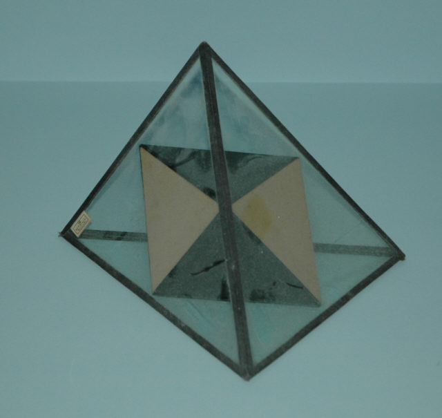 Modelo cristalográfico em vidro, utilizado na visualização da estrutura interna dos minerais nas aulas de Mineralogia/Geologia. As arestas encontram-se coladas e revestidas a fita adesiva preta.