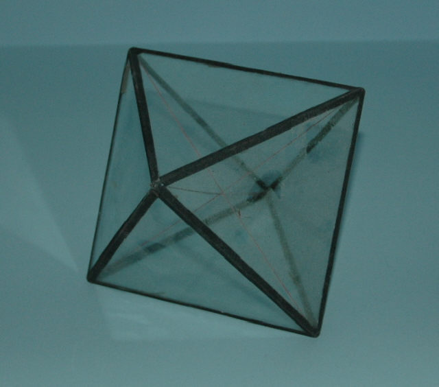 Modelo cristalográfico em vidro, com sistema de eixos axiais representados por fio de algodão colorido no seu interior, utilizado na visualização da estrutura interna dos minerais nas aulas de Mineralogia/Geologia. As arestas encontram-se coladas e revestidas a fita adesiva preta.