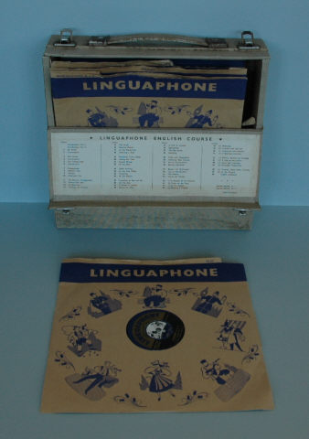 Mala com conjunto de discos de vinil, utilizados para a aprendizagem da língua inglesa. Estes discos dizem respeito às lições 1 a 30 do Linguaphone English Course. Cada disco de vinil encontra-se acondicionado num envelope e a caixa apresenta uma legenda com a lista de lições e respectivo título.