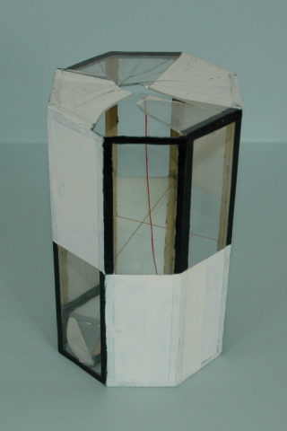 Modelo cristalográfico em vidro, com sistema de eixos axiais representados por fio de algodão colorido no seu interior, utilizado na visualização da estrutura interna dos minerais nas aulas de Mineralogia/Geologia. As arestas encontram-se coladas e revestidas a fita adesiva preta.