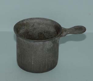 Cadinho de metal, de formato cilíndrico, com pega circular achatada e colocada junto ao bordo. Utilizado em contexto de práticas pedagógicas no Laboratório de Química.