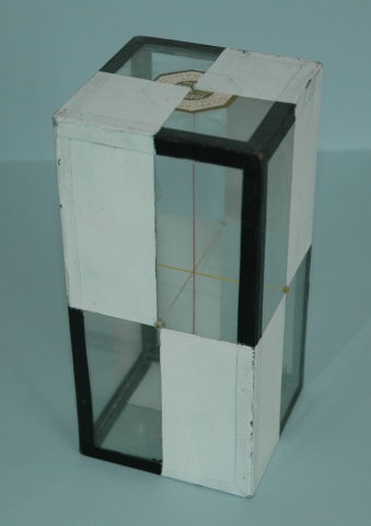 Modelo cristalográfico em vidro, com sistema de eixos axiais representados por fio de algodão colorido no seu interior, utilizado na visualização da estrutura interna dos minerais nas aulas de Mineralogia/Geologia. As arestas encontram-se coladas e revestidas a fita adesiva preta.