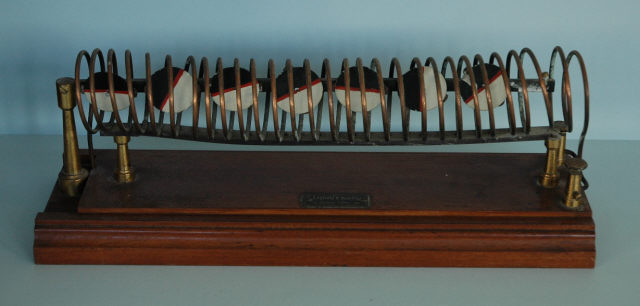 Instrumento científico composto por um sistema de correntes circulares enroladas em hélice, próximas umas das outras, encaixado num suporte metálico assente sobre uma base de madeira com dois bornes de ligação. Este dispositivo permite explicar as propriedades magnéticas dos ímanes tendo como base as correntes circulares geradas nas suas moléculas.