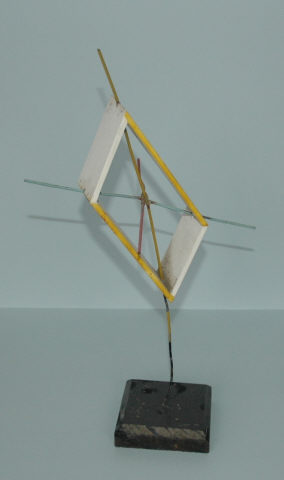 Eixo cristalográfico, com eixos montados num suporte de madeira, utilizado no estudo da visualização da estrutura interna dos minerais nas aulas de Mineralogia/Geologia.