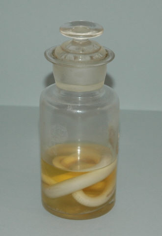 Cobra conservada em solução de formol, num recipiente de vidro, utilizada no estudo e observação de espécies nas aulas de Ciências Naturais. Classificação científica: Reino: Animalia; Filo: Chordata; Classe: Reptilia; Ordem: Squamata; Subordem: Serpentes.