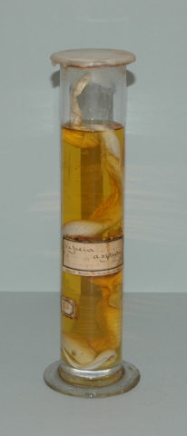 Cobra conservada em solução de formol, num recipiente de vidro, utilizada no estudo e observação de espécies nas aulas de Ciências Naturais. Classificação científica: Reino: Animalia; Filo: Chordata; Classe: Reptilia; Ordem: Squamata; Subordem: Serpentes.