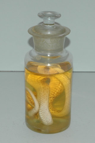Cobra conservada em solução de formol, num recipiente de vidro, utilizada no estudo e observação de espécies nas aulas de Ciências Naturais. Classificação científica: Reino: Animalia; Filo: Chordata; Classe: Reptilia; Ordem: Squamata; Subordem: Serpentes.