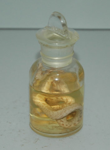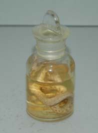 Cobra conservada em solução de formol, num recipiente de vidro, utilizada no estudo e observação de espécies nas aulas de Ciências Naturais. Classificação científica: Reino: Animalia; Filo: Chordata; Classe: Reptilia; Ordem: Squamata; Subordem: Serpentes.