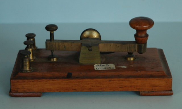 Emissor de telégrafo de Morse formado por uma única tecla que, quando premida emite num circuito eléctrico um sinal sonoro, luminoso ou um sinal marcado numa tira de papel no receptor. Este tipo de comunicação criado por Samuel Morse (1791 - 1872), utilizava um código sob a forma de pontos e traços que traduz o alfabeto inteiro, a pontuação e os algarismos.