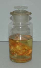 Pintasilgo conservado num recipiente de vidro, em solução de formol, utilizado no estudo e observação nas aulas de Ciências Naturais.