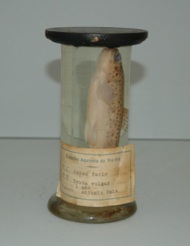 Truta conservada num recipiente de vidro, em solução de formol, utilizado no estudo e observação nas aulas de Ciências Naturais.