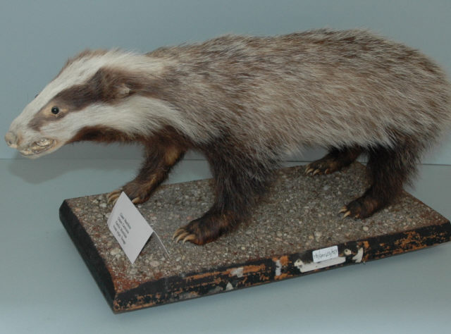 Texugo taxidermizado montado numa base rectangular de madeira, utilizado no estudo e observação de espécies nas aulas de Ciências Naturais/Biologia. O texugo está assente nas quatro patas, em posição de alerta, com a cauda caída e deixando ver a dentição.Tem olhos de vidro, imitando o aspecto natural. A pelagem é em tons de castanho, indo do castanho escuro (nos membros e risca na cabeça), até ao bege , no resto do corpo. A risca escura da cabeça vai desde o focinho até às orelhas, passando pelos olhos. Classificação científica: Reino: Animalia, Filo: Chordata, Classe:Mammalia, Ordem:Carnivora,Subordem: Fissipedia, Família:Mustelidae, Género:Meles.