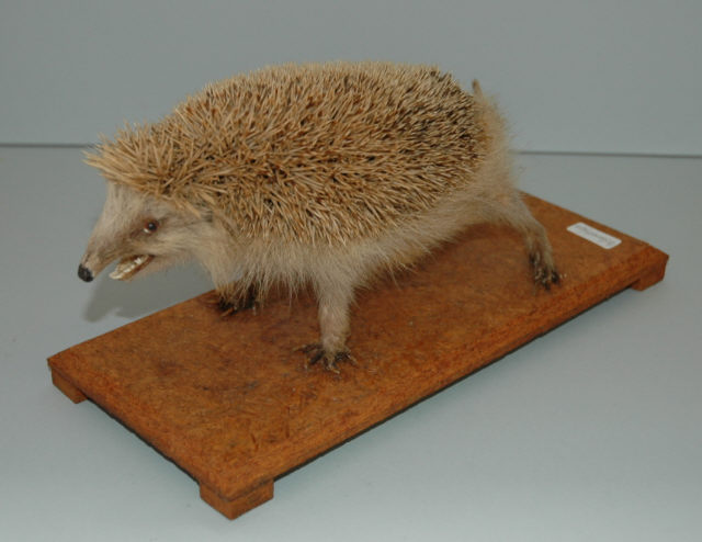 Porco espinho taxidermizado, que servia para estudo e observação nas aulas de Ciências Naturais, montado numa base rectangular de madeira. Classificação científica - Reino: Animalia;Classe: Mamíferos; Ordem: Rodentia; Família: Hystricidae; Nome científico: Hystrix africaeaustralis.