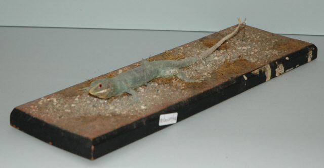 Espécime que servia para estudo e observação nas aulas de Ciências Naturais. O exemplar taxidermizado encontra-se numa superfície de madeira, coberta com pedras. Classificação científica - Reino: Animalia; Filo: Chordata; Classe: Reptilia; Ordem: Squamata; Família: Lacertidae; Género: Lacerta; Espécie: L. lepida. O Sardão (Lacerta lepida) é um lagarto da família Lacertidae, com 30 a 60 centímetros de comprimento, sendo que dois terços do seu tamanho correspondem à cauda. Vive em zonas secas, com arbustos, zonas rochosas ou mesmo em áreas cultivadas. Consegue viver cerca de 25 anos em cativeiro. O dorso é normalmente verde ou por vezes cinzento com tons de castanho. Alimenta-se de insectos e, ocasionalmente, de pequenos mamíferos e plantas.