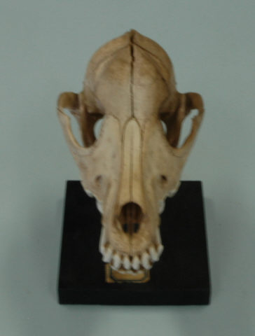 Estrutura craniana de um animal carnívoro, não identificado, utilizado para estudo e observação nas aulas de Ciências Naturais.