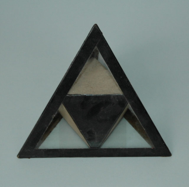 Modelo cristalográfico em vidro utilizado na visualização da estrutura interna dos minerais nas aulas de Mineralogia/Geologia. As arestas encontram-se coladas e revestidas a fita adesiva preta.
