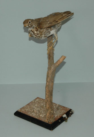 Espécime taxidermizado utilizado para o estudo e observação nas aulas de Ciências Naturais. Trata-se de um tordo que se encontra pousado sobre um galho apoiado numa base de madeira rectangular com quatro pés de apoio. É uma ave muito semelhante à tordoveia, embora de porte mais pequeno. Tem plumagem castanha em todo corpo, à excepção do peito que é branco com pequenas manchas. Distribui-se geograficamente por toda a Europa, incluíndo Portugal. Classificação científica: Reino - Animalia; Filo - Chordata; Classe - Aves; Ordem - Passeriformes; Família: Muscicapidae; Género: Turdus.