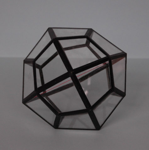 Modelo cristalográfico em vidro, com sistema de eixos axiais representados por fio de algodão colorido no seu interior, utilizado na visualização da estrutura interna dos minerais nas aulas de Mineralogia/Geologia. As arestas encontram-se coladas e revestidas a fita adesiva preta.
