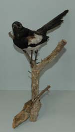 Pega taxidermizada utilizada como elemento de estudo e observação nas aulas de Ciências Naturais. Apresenta plumagem preta, na cabeça e peito, e branca, na zona superior das asas. A cauda é acastanhada. Classificação científica: Reino - Animalia; Filo - Chordata; Classe - Aves; Ordem - Passeriformes; Família - Corvidae; Género - Pica; Espécie - Pica pica.