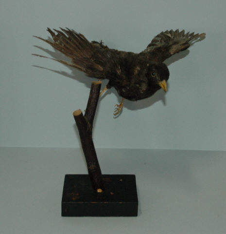 Espécime taxidermizado utilizado para o estudo e observação nas aulas de Ciências Naturais. Trata-se de um melro que se encontra apoiado num galho, assente numa base de madeira. É uma ave de pequeno porte com plumagem castanha. Classificação científica - Reino: Animalia; Filo: Chordata; Classe: Aves; Ordem: Passeriformes; Família: Muscicapidae; Género: Turdus.